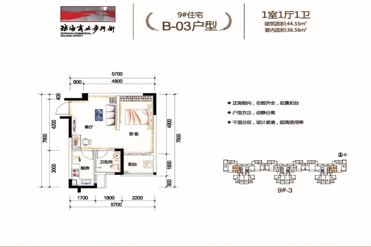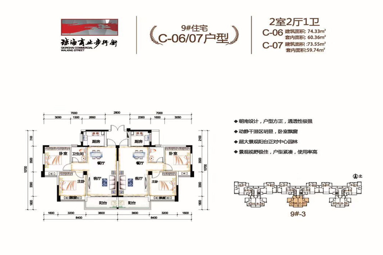 琼海商业步行街9#-1栋、9#-2栋、9#-3栋在售,建面44.55平米(一房)、74-87平米(两房)、90平米(两房)、115-127平米(三房),均价13800元/平米。